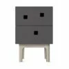 – Er ist aus pulverbeschichtetem Stahl in verschiedenen Farben hergestellt und hat eine zylindrische Form mit drei Regalböden und Rädern.