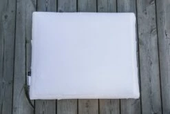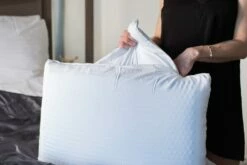 Hybrid pillow from Cura of Sweden with a down-like polyester filling in separate boxes on one side and memory foam and a cooling gel plate on the other side. In the middle, there is a removable cushion insert, which provides adjustable height.